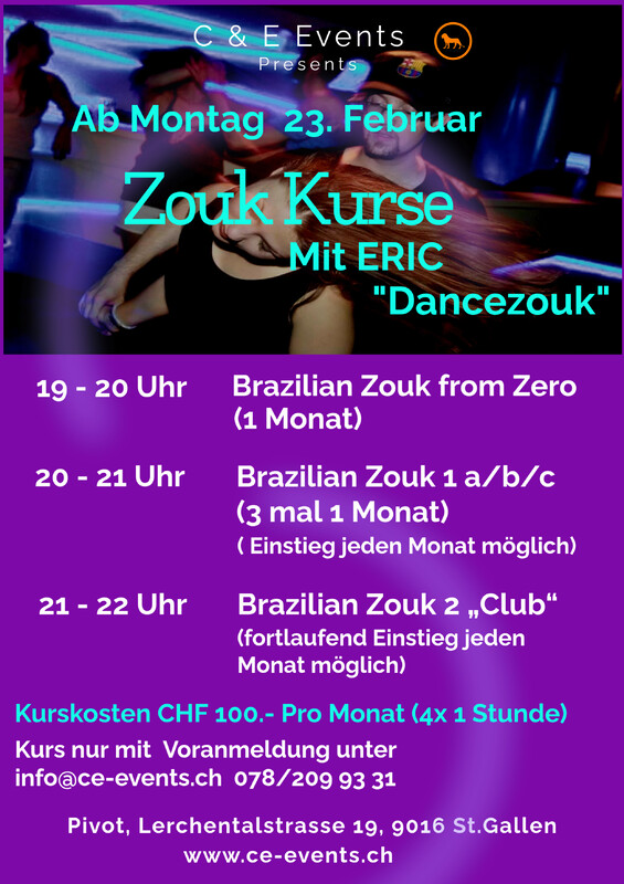 Neue Zouk Kurse in St. Gallen!!! 19-20 Uhr Brazilian Zouk from Zero (1 Monat) Mache deine ersten Tanzschritte mit uns und lerne zusammen mit einem Partner über das Parkett zu gleiten mit ganz einfachen Ideen & Grundsätzen. Und vor Allem mit ganz viel Spass & Freude! Vorkenntnisse: keine nötig und du kannst dich gerne auch alleine anmelden. 20 - 21 Uhr Brazilian Zouk 1 a/b/c (3 mal 1 Monat) Entdecke die magische Verbindung von Rythmus & Fluss und erlebe Brasilianisches Lebensgefühl in diesem modernen Paartanz. In drei Monaten lernst du mit uns die wichtigsten Grundschritte und Grundkonzepte die Brazilian Zouk ausmachen, damit du überall mittanzen kannst. Vorkenntnisse: entweder „Brazilian Zouk from Zero“, Privatstunden oder irgendein anderer Paartanz. Reihenfolge der Module ist egal. Du bist mit Partner und auch alleine herzlich willkommen. (Einstieg jeden Monat möglich) 21 - 22 Uhr Brazilian Zouk 2 „Club“ (fortlaufend Einstieg jeden Monat möglich) Hier verbinden wir Elemente, kreieren eigene Figuren, meistern Übergänge und vor Allem haben wir zusammen Spass am spielerischen Tanzen. Wir treffen uns um neue Ideen auszuprobieren und trainieren nebenher, wie wir unser Tanzen noch angenehmer & abwechslungsreicher machen können. Vorkenntnisse: „Brazilian Zouk 1“ abgeschlossen (a, b + c) oder Minimum 3 Monate Erfahrung. Weitere Kurse & Privatstunden auf Anfrage sind auch möglich. Kurskosten: Pro Monat 100 CHF (4x 1 Std.) Location: Pivot, Lerchentalstrasse 19, 9016 St.Gallen Die Kurse finden nur statt bei genügend Anmeldungen. Wir freuen uns auf schöne Tanzstunden mit euch!!! www.ce-events.ch