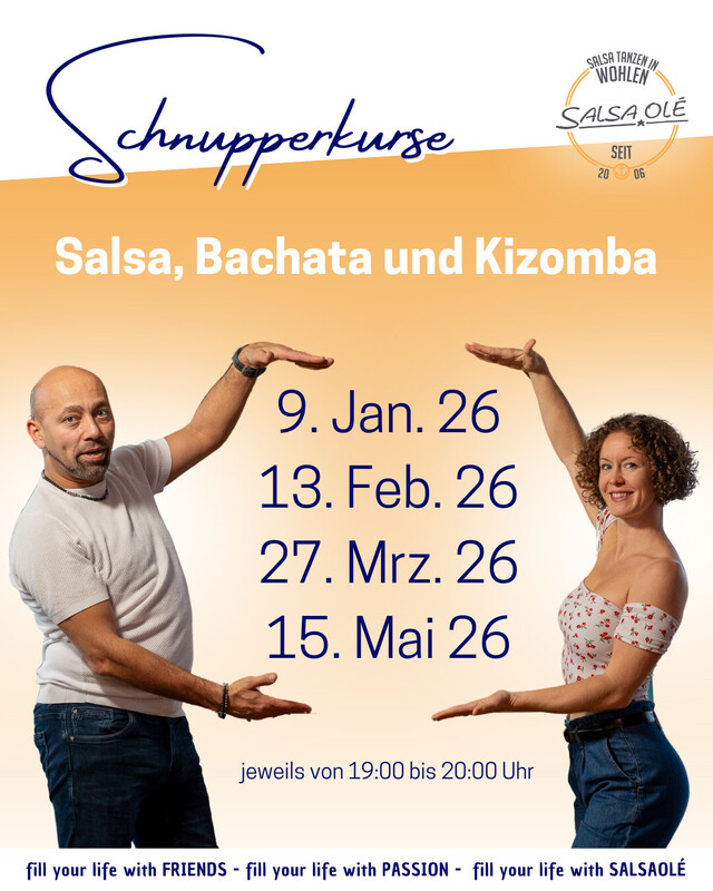 Komm vorbei, nimm deine Freunde, Family, Nachbarn & Co. mit und probier es einfach aus - kostenlos und unverbindlich! Hat es dir gefallen, können wir gleich anschliessend mit dir unser aktuelles Kursprogramm anschauen, wir finden bestimmt eine passende Einstiegsmöglichkeit! Diese Probelektionen finden IMMER statt! Wir freuen uns auf dich! www.salsaole.ch