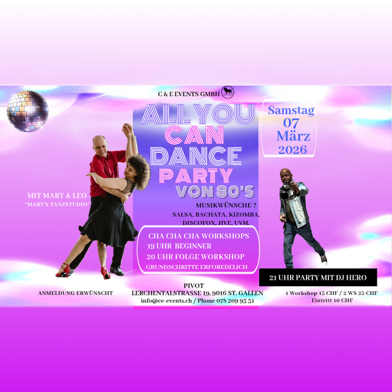 Lasst uns abtanzen und das Leben feiern am Freitag den 7. März im Pivot in St.Gallen!!! ALL YOU CAN DANCE PARTY 2 Cha-Cha-Cha Workshop mit Mary & Leo « Mary’s Tanzstudio» 19 Uhr Beginner 20 Uhr Folge Workshop Grundschritte erforderlich Anmeldung erwünscht!!! 1 Workshop 15 CHF / 2 Workshop 25 CHF / Party: 10 CHF Eintritt Party ab 21 Uhr mit DJ Hero Salsa Bachata Kizomba Discofox Jive Cha Cha Cha uvm. Zahlungsmöglichkeit: Twint oder Cash. Keine Kartenzahlung möglich!! Workshop Anmeldung und Infos: Phone 078 209 93 31 oder per Mail an info@ce-events.ch Parkplätze vor dem Haus und weitere an der Lerchentalstrasse 21 beim Stoffwechselzentrum Gästeparkplätze, weitere Gästeparkplätze auf dem Kiesplatz bei Altrimo und Stoffwechselzentrum!! Wir freuen uns auf einen schönen Abend mit Euch! www.ce-events.ch