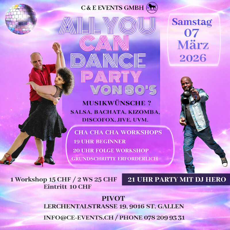 Lasst uns abtanzen und das Leben feiern am Freitag den 7. März im Pivot in St.Gallen!!! ALL YOU CAN DANCE PARTY 2 Cha-Cha-Cha Workshop mit Mary & Leo « Mary’s Tanzstudio» 19 Uhr Beginner 20 Uhr Folge Workshop Grundschritte erforderlich Anmeldung erwünscht!!! 1 Workshop 15 CHF / 2 Workshop 25 CHF / Party: 10 CHF Eintritt Party ab 21 Uhr mit DJ Hero Salsa Bachata Kizomba Discofox Jive Cha Cha Cha uvm. Zahlungsmöglichkeit: Twint oder Cash. Keine Kartenzahlung möglich!! Workshop Anmeldung und Infos: Phone 078 209 93 31 oder per Mail an info@ce-events.ch Parkplätze vor dem Haus und weitere an der Lerchentalstrasse 21 beim Stoffwechselzentrum Gästeparkplätze, weitere Gästeparkplätze auf dem Kiesplatz bei Altrimo und Stoffwechselzentrum!! Wir freuen uns auf einen schönen Abend mit Euch! www.ce-events.ch