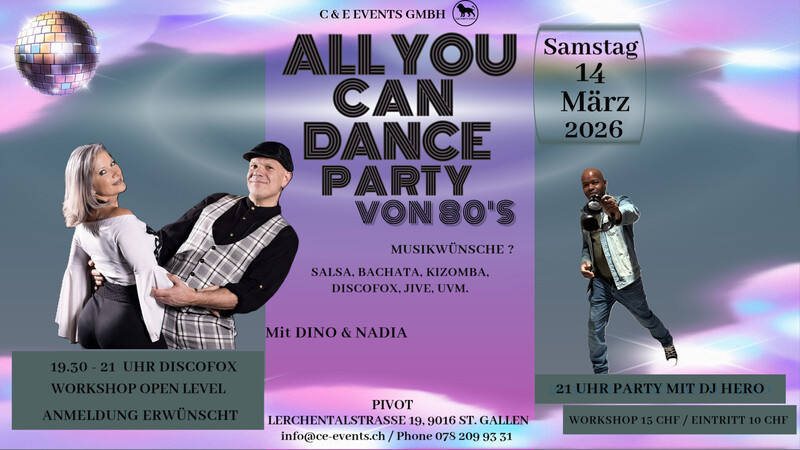 Lasst uns abtanzen und das Leben feiern am Freitag den 14. März im Pivot in St.Gallen!!! ALL YOU CAN DANCE PARTY 19.30 Uhr Discofox Workshop Open Level mit Nadia & Dino Anmeldung erwünscht!!! 1 Workshop 15 CHF / Party: 10 CHF Eintritt Party ab 21 Uhr mit DJ Hero Salsa Bachata Kizomba Discofox Jive Cha Cha Cha uvm. Zahlungsmöglichkeit: Twint oder Cash. Keine Kartenzahlung möglich!! Workshop Anmeldung und Infos: Phone 078 209 93 31 oder per Mail an info@ce-events.ch Parkplätze vor dem Haus und weitere an der Lerchentalstrasse 21 beim Stoffwechselzentrum Gästeparkplätze, weitere Gästeparkplätze auf dem Kiesplatz bei Altrimo und Stoffwechselzentrum!! Wir freuen uns auf einen schönen Abend mit Euch! www.ce-events.ch