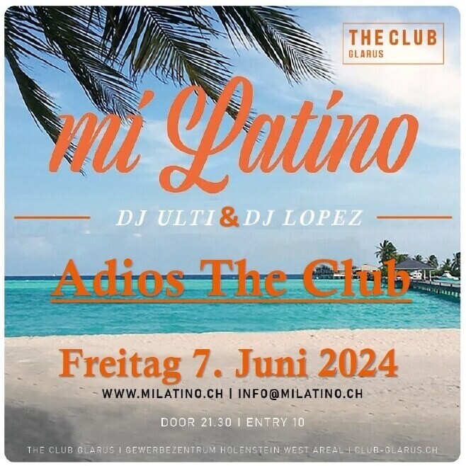 Wir sagen "Adios to THE CLUB" Diese letzte miLatino-Veranstaltung im The Club Glarus wird ein unvergessliches Highlight! Mit Stolz und Freude blicken wir auf sieben fantastische Jahre zurück und möchten Thomy herzlich danken, dass er uns die Chance gegeben hat, unseren kleinen miLatino-Verein im legendären The Club zum Leben zu erwecken. Zum großen Finale werden DJ Ulti und DJ Lopez als dynamisches Duo auftreten und das Beste aus der Salsa- und Latin-Szene im Glarnerland präsentieren. Lasst uns gemeinsam eine unvergessliche Nacht feiern und die letzten Momente dieser Ära mit Energie und Leidenschaft füllen. Wir freuen uns darauf, viele von euch zu sehen, um die letzte miLatino-Veranstaltung zu einem glanzvollen Abschied zu machen. Bis zum 7. Juni im The Club Glarus milatino.ch
