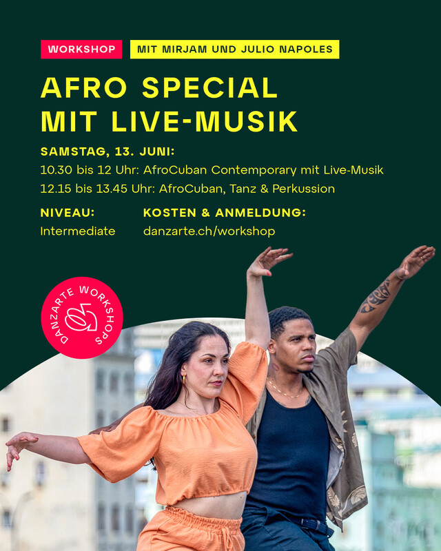 Erlebe die kraftvolle Verbindung von Tanz und Live-Musik! Dieses Special vereint AfroCuban Contemporary sowie AfroCuban, Tanz & Perkussion und schafft ein intensives Erlebnis aus Rhythmus, Bewegung und Ausdruck. Programm: 10:30–12:00 Uhr – AfroCuban Contemporary mit Live-Musik 12:15–13:45 Uhr – AfroCuban, Tanz & Perkussion Niveau: Intermediate https://danzarte.ch/salsa-workshops-in-bern/