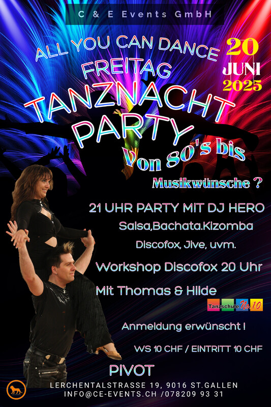 Lasst uns abtanzen und das Leben feiern am Freitag den 20. Juni im Pivot in St.Gallen mit der neuen Tanznacht Party im Pivot!!! Discofox Workshop mit Thomas und Hilde " Tanzschule No10" von 20.00 – 21.00 Uhr Der Discofox Workshop richtet sich an Tänzer, die bereits die Basic-Schritte beherrschen. Der Kurs wird von einem erfahrenen ADTV- und BDT-zertifizierten Lehrer geleitet, der mehrfacher Deutscher Meister in Discofox ist. Ziel ist es, die bereits vorhandenen Grundkenntnisse zu vertiefen und neue Figuren sowie Techniken zu erlernen, um noch sicherer und mit mehr Freude zu tanzen. Workshop 10 CHF / Party: 10 CHF Eintritt Party ab 21.00 Uhr mit DJ Hero Workshop Anmeldung und Infos: Phone 078 209 93 31 oder per Mail an info@ce-events.ch Wir freuen uns auf einen schönen Abend mit Euch! C & E Events GmbH/Pivot www.ce-events.ch