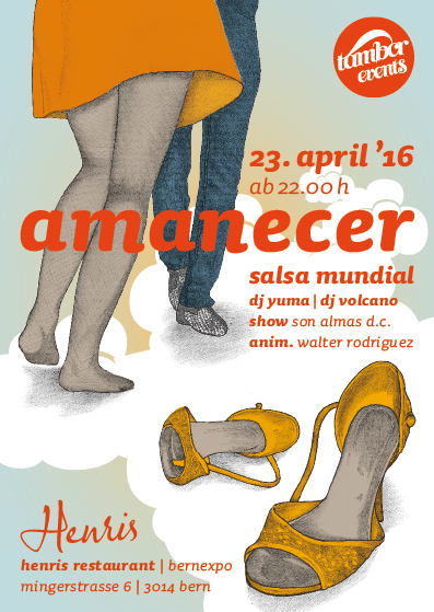 Neue Party, neuer Ort!!! Tamborevents präsentiert euch "amanecer" Die neue Salsaparty in Bern! Mit Salsa von A-Z, Bachata, ChaChaCha und alles was es sonst noch braucht! Mit Show von "son almas" und Animation by "Walter Rodriguez" Achtung: Das Beagelände ist geschlossen wegen der Ausstellung. Es ist der Eingang A am Guisanplatz zu benutzen! Also nichts wie hin, wir freuen uns auf euch! TAMBOREVENTS-TEAM
