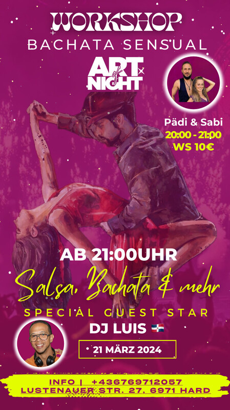 Salsa Night jeden Donnerstag im "Art of Night" (ehemalige Nachtschicht) ab 20:00 Uhr. Workshop Bachata Sensual mit Pädi & Sabi von 20:00 bis 21:00 Uhr. Kommt und geniesst mit uns in fantastischer Atmosphäre lateinamerikanische Rhythmen mit DJ Luis. Salsa, Bachata, Merengue & mehr. Adresse : Lustenauer Straße 27, 6971 Hard-Österreich. Kostenlos (Sektempfang und warmes Buffet) https://www.facebook.com/vr.oa.2024