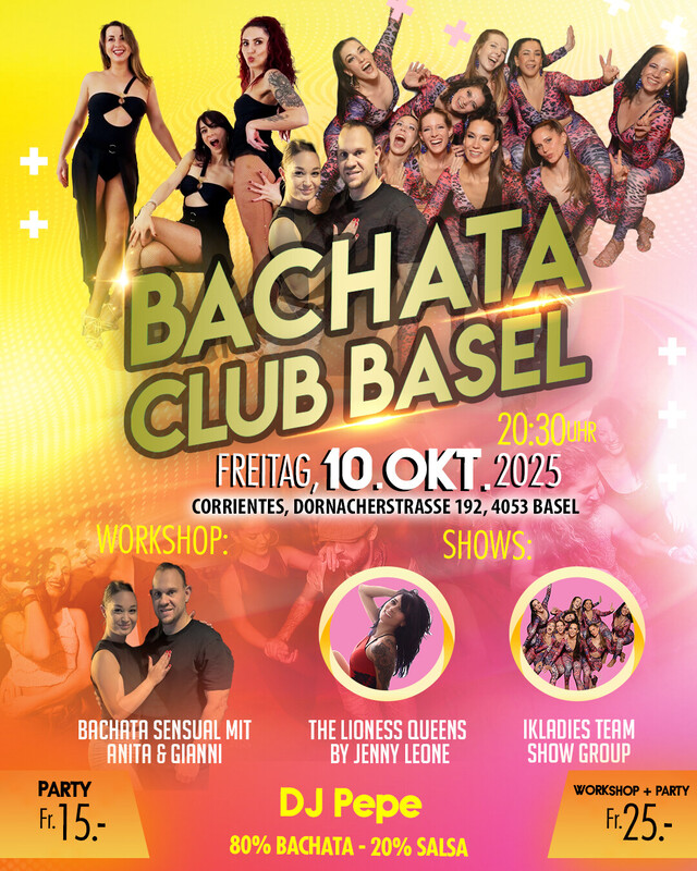 💛 BACHATA CLUB Basel mit DJ Pepe 💛 📅 Freitag, 10. Oktober 2025 📍 Corrientes, Dornacherstrasse 192, Basel 🕣 20:30–21:30 Uhr – Bachata Sensual Workshop mit Anita & Gianni 🎶 Ab 21:30 Uhr – Party mit den besten Bachata-Songs ✨ Mitternacht Highlights: 🔥 Bachata-Shows von The Lioness Queens by Jenny Leone 🔥 IK-Ladies Show Group (Leitung: Kira Lareida, Mexiko) 🌍 Wir erwarten Bachateras & Bachateros aus Frankreich, Deutschland & der Schweiz! 🎟️ Eintritt: Party CHF 15.– | Party + Workshop CHF 25.–