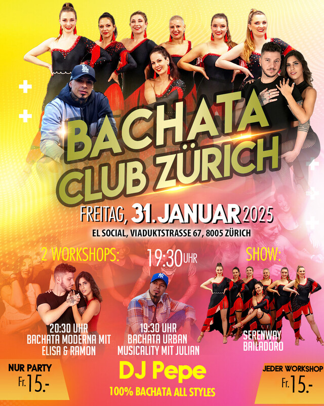 Bachata Club Zürich mit DJ Pepe Freitag, 31. Januar 2025 Wir freuen uns, eine neue Bachata-Party-Reihe im El Social in Zürich anzukündigen. Diesmal treffen wir uns an einem Freitag und feiern ausgelassen. Zwei tolle Workshops und eine Show runden das Programm ab. Auf eine zahlreiche Teilnahme freuen wir uns ebenfalls! Workshops: 19:30 Uhr - Bachata Urban Musicality mit Julian 20:30 Uhr - Bachata Moderna mit Elisa & Ramon (CH-Bachatameister. Show: Serenway by Bailadoro 100 % Bachata-Party: Ab 21:30 Uhr mit den besten Bachata-Hits. Eintritt & 2 Workshops: CHF 40.- Nur Party: CHF 15.- Jeder Workshop: CHF 15.- Veranstaltungsort: El Social Viaduktstrasse 67 8005 Zürich