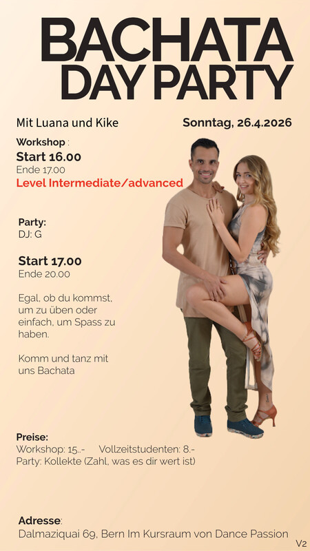 Workshop Start 16.00h Ende 17.00h Level: Intermediate/advanced Party: DJ: G Start 17.00h Ende 20.00h Preise: Workshop: 15..- Vollzeitstudenten: 8.- Party: 10.- Vollzeitstudenten: 5.- Follow us: Instagram: https://www.instagram.com/bachatadaypartybern/ Facebook: Group: https://www.facebook.com/groups/771505198238426 Salsa.ch: https://www.salsa.ch/venues/dance-passion-bern-65 www.bachata-bern.ch