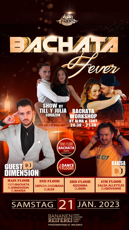🔥 BACHATA FEVER 🔥 2023 Show & Workshop Bananenreiferei 🔥 Samstag 21. Januar 2023 🔥 4 DANCE FLOORS 🔥🔥🔥 🔥 DOORS: 21:30 – 04:00 UHR 🔥 EINTRITT CHF 20.- 🔥 EINTRITT: BEZAHLUNG AN DER KASSE NUR BARGELD 🔥 GRATIS GARDEROBE 🔥 400 AUTO PARKPLÄTZE 🔥🔥🔥 Seit unserem ersten BACHATA FEVER Event im Jahr 2018 wussten wir, dass Bachata die neue lateinamerikanische Tanzsensation in Zürich - Schweiz sein würde und heute der Tanz der Wahl für seine Sinnlichkeit, Romantik und Attraktivität ist. Heute ist BACHATA FEVER der Treffpunkt für die besten Tänzer, DJs, Shows und Workshops im In- und Ausland, Shows und Workshops mit nationalen und internationalen Künstlern, die ihre Professionalität und ihren Stil zeigen, in einer Umgebung, die im Bachata-Fieber-Stil dekoriert ist, begleitet von unseren professionellen nationalen und internationalen DJs, die es verstehen, das Beste aus dem sinnlichen, fusionierten, romantischen und klassischen Bachata-Stil auf 4 Tanzflächen zu geben. Juanes immer mit dem Knüller der lateinamerikanischen Tänze in der Schweiz. Willkommen bei BACHATA FEVER in der Bananenreiferei. 🔥🔥🔥 20:30 Uhr WORKSHOP BY TONY & ALMA. INTERMEDIATE, Bachata Flow Sie brauchen nicht zu buchen, kommen Sie direkt zum Bananenreiferei am Samstag, 21. Januar 2023 um 20:15 Uhr. Der Workshop Preis ist CHF 25.- Inkl. Garderobe & Party auf 4 Dance Floors. 00:00 Uhr BACHATA SHOW BY: TILL Y JULIA SHOW: CORAZÓN aus Bern 🔥🔥🔥 SHOW BY TILL & JULIA Bachata Show aus Bern 🔥🔥🔥 🔥 MAIN FLOOR: 100% BACHATA FEVER (371 m2 Dance Floor) 🔥 DJ DIMEN5ION 🔥 DJ BAKISTA Bachata Fusion, Sensual, Moderna, Clasica, Del Recuerdo 🔥🔥🔥 🔥 2ND FLOOR: 100% SALSA CUBANA: DJ ALEX 100% Salsa Cubana, Timba, Rumba,Fiesta. 🔥🔥🔥 🔥 3RD FLOOR: KIZOMBA FEVER: DJ SKIN Kizomba, Semba, Tarraxinha, Afrohouse, Urban Kiz 🔥🔥🔥 🔥 4TH FLOOR: SALSA ALLSTYLES DJ GIOVANNI Salsa Allstyles, Clasica, Puertorriqueña, Romantica 🔥🔥🔥 BANANENREIFEREI Pfingstweidstrasse 101 8005 Zürich 🔥🔥🔥 SEARCH MAP https://map.search.ch/Bananenreiferei,Z%C3%BCrich... 🔥🔥🔥 DATES 2023 BACHATA FEVER BANAANENREIFEREI . Sa 21. Januar 2023 . Sa 18. Februar 2023 . Sa 18. März 2023 . Sa 15. April 2023 . Sa 20. Mai 2023 . Sa 17. Juni 2023 . Sa 15. Juli 2023 . Sa 19. August 2023 . Sa 21. Oktober 2023 . Sa 16.Dezember 2023 🔥🔥🔥 FOLLOW US in INSTAGRAM https://www.instagram.com/bachata_fever_juanes/ 🔥🔥 OFFICIAL JUANES EVENTS FACEBOOK https://www.facebook.com/juanesevents 🔥🔥 Bienvenidos Juanes Events https://juanesevents.ch/ http://juanesevents.ch/