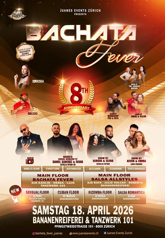 🔥 BACHATA FEVER 🔥 8 YEARS ANIVERSARY SHOWS, WORKSHOPS & ANIMATION SAMSTAG 18. APRIL 2026 BANANENREIFEREI & TANZWERK 101 ●●●● Heute möchten wir unseren herzlichsten Dank an alle 🔥 BACHATA FEVER 🔥 Fans aussprechen. Seit der ersten Edition im Jahr 2018 seid ihr der Motor, die Energie und die Inspiration, die diese Party zu dem gemacht haben, was sie heute ist, die beliebteste und meist erwartete Bachata-Party überhaupt. Ein großes Dankeschön auch an unsere großartigen Bachata-DJs, die Shows und Workshops, ihr seid das Herz von BF Ohne euch wäre das alles nicht möglich. ●●●● 🔥 AB 22 JAHREN 🔥 2 GROSSE CLUBS 🔥 6 DANCE FLOORS 🔥 DOORS: 21:30 – 04:00 UHR 🔥 10 TOP SALSA, BACHATA, CUBA, KIZOMBA DJS 🔥 TOP NATIONALE & INTERNATIONALE SHOWS 🔥 2x GRATIS GARDEROBE 🔥 2x EINGANG 🔥 EINTRITT: BEZAHLUNG AN DER KASSE NUR BARGELD 🔥 GETRÄNKE-BAR: BARGELD & CREDITCARD 🔥 300 AUTO PARKPLÄTZE ●●●● AB 19:30 UHR WORKSHOPS BACHATA SENSUAL BY PED & RITA 🔥 19:30 bis 20:30 Uhr Bananenreiferei 🔥 ARTIST: Ped & Rita 🔥 STYLE: Bachata Sensual 🔥 LAVEL: Intermediate 🔥 VON: Bachata Sence ●●●● 20:30 UHR BACHATA SENSUAL BY DANIEL SANCHEZ & IVANA 🔥 20:30 bis 21:30 Uhr Bananenreiferei 🔥 ARTIST: Daniel Sanchez & Ivana 🔥 STYLE: Sensual ●●●● Sie brauchen nicht zu buchen, kommen Sie direkt zum Club Bananenreiferei am Samstag 18. April um 19:15 Uhr. Der Workshop Preis ist CHF 30.- Inkl. Garderobe & Party 6 Floors ●●●● 🔥 SHOWS 00:00 Uhr IN TANZWERK 101 🔥 SHOW: by EDU & VIR (Bachata Madrid-Spain 🔥 SHOW: by JESSY & FEDON - Premier-Bongo Dance Company 🔥 SHOW: by KEVIN & EMMA (Bachata Lion-France) 🔥 SHOW: by THE LION QUENS (Bachata-Zürich) 🔥 SHOW: by MARC & OZLEM (Bachata-Zürich) ●●●● Während der Shows wird die Musik im anderen Dance Floor nicht aufhören, sondern ohne Pause weiterlaufen. ●●●● MAIN FLOOR: BACHATA FEVER FLOOR TANZWERK 101 >> 371 m² Dance Floor 🔥 DJ KAHLID (Copenague) 🔥 DJ DESEA (De) 🔥 DJ LUJO (Pt) 100% Bachata Fusion, Sensual, Moderna, Clasica, del Recuerdo ●●●● MAIN FLOOR: SALSA ALLSTYLES>> BANANENREIFEREI >> 368 m² Dance Floor 🔥 DJ RAFA (Bs) 🔥 DJ JULIO VOLCAN (De) 🔥 DJ ROBERTO (De) Salsa Allstyles - Clasica – Puertorriqueña - Salsa Pal Bailador. ●●●● 3rd SENSUAL BACHATA FLOOR. (Tanzwerk 101) DJ ÑOÑO Best of Sensual & Remix Floor ●●●● 4Th FLOOR CUBANO>> (Bananenreiferei) 🔥 DJ MANUEL 100% Salsa Cubana / Timba / Cubaton / Fiesta ●●●● 5th FLOOR: KIZOMBA>> (Bananenreiferei) 🔥 DJ FAYOLA Kizomba Semba Tarraxinha Urban Kiz ●●●● 6th FLOOR: SALSA ROMANTICA>> (Bananenreiferei) 🔥 IVAN Salsa Romantica ●●●● AUF DEM DACH DER BANANENREIFEREI & TANZWERK 101 HABEN WIR PARKPLÄTZE FÜR 300 AUTOS. ●●●● Eintritt CHF 25.- Inkl. 5 Dance Floors & 2 Gratis Garderobe ●●●● ✯ Du kannst Dein SPECIAL TICKET in Deiner Tanzschule oder bei Salsa, Bachata, Kizomba, DJs & Partner bestellen ab 13. April 26, es in Deinem Handy aufbewahren, an der Kasse vorzeigen und Du erhältst einen Rabatt von CHF 5.- >>Bitte beachten Sie, dass der Gutschein im Wert von CHF 5.- nicht für die Workshops gültig ist, sondern nur für die Party. ●●●● 2 EINGÄNGE UND KASSEN: 1. BEI BANANENREIFEREI: KASSE UND GARDEROBE, Sie können durch die Bananenreiferei eintreten, dort haben wir eine Kasse und Garderobe. 2. BEIM TANZWERK 101: KASSE UND GARDEROBE, Sie können durch die Tanzwerk 101 eintreten, dort haben wir eine Kasse und Garderobe. ●●●● LOCATION: BANANENREIFEREI & TANZWERK 101 Pfingstweidstrasse 101 8005 Zürich ●●●● Bienvenidos Juanes Events https://juanesevents.ch/