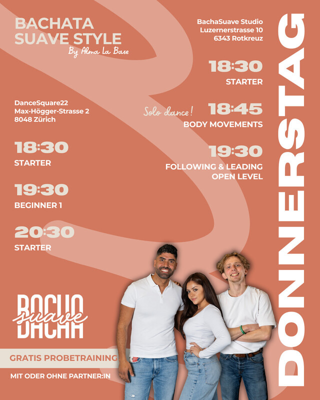 In diesem Kurs arbeitest du gezielt an den Grundlagen von Leading & Following und lernst, Signale klar zu geben und sicher zu empfangen. Durch bewusstes Führen und sensibles Folgen entwickelst du eine gute Körperspannung und eine klare Kommunikation über deine Körpersprache. Du bekommst ein besseres Verständnis für die Leader- und Follower-Rolle, gewinnst mehr Kontrolle und Flow in deinem Tanz und lernst, dich entspannter zu bewegen. Der Fokus liegt dabei auf echter Connection – durch saubere Technik, bewusste Körperhaltung und klare Führung. Perfekt für alle, die ihr Bachata auf das nächste Level bringen möchten www.bachasuave.com