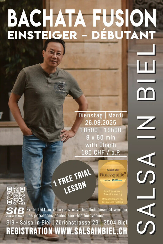 💃 Bachata Einsteigerkurs – der perfekte Einstieg in die Welt des Tanzens! Sanfte Bewegungen, sinnliche Rhythmen und ganz viel Lebensfreude – das ist Bachata! In unserem Einsteigerkurs lernst du Schritt für Schritt die Grundlagen dieses beliebten Tanzes. Du brauchst keine Vorkenntnisse, nur Neugier und Lust auf Bewegung zur Musik. Was dich erwartet: 🎶 Grundschritte & Rhythmusgefühl 🕺 Erste einfache Figuren & Drehungen 💬 Klare, verständliche Erklärungen 💞 Tanzen in entspannter, respektvoller Atmosphäre 😊 Viel Spass und gute Laune garantiert! Für wen? Alle, die neu starten oder schon immer tanzen wollten – mit oder ohne Tanzpartner*in. 👉 Die erste Lektion ist eine unverbindliche Probestunde. Komm vorbei, lern uns kennen und spüre den Rhythmus – ganz ohne Verpflichtung! Lass dich vom Bachata-Fieber anstecken und tanz dich glücklich! Melde dich jetzt an – wir freuen uns auf dich! Anmeldung: https://anmeldung.salsainbiel.ch 🇫🇷 🇫🇷 🇫🇷 💃 Cours débutant de Bachata – l’entrée idéale dans l’univers de la danse ! Mouvements doux, rythmes sensuels et une grande dose de joie de vivre – c’est ça la Bachata ! Dans notre cours pour débutants, tu apprendras pas à pas les bases de cette danse populaire. Aucun prérequis nécessaire – il suffit d’avoir de la curiosité et l’envie de bouger en musique. Ce qui t’attend : 🎶 Pas de base et sens du rythme 🕺 Premières figures simples et tours 💬 Explications claires et faciles à suivre 💞 Une ambiance détendue et respectueuse 😊 Beaucoup de plaisir et de bonne humeur garantis ! Pour qui ? Pour toutes celles et ceux qui souhaitent se lancer – avec ou sans partenaire. 👉 Le premier cours est un essai gratuit et sans engagement. Viens découvrir notre équipe et ressentir le rythme – sans aucune obligation ! Laisse-toi emporter par la fièvre de la Bachata et danse avec le sourire ! Inscris-toi dès maintenant – nous nous réjouissons de t’accueillir ! Inscription : https://inscription.salsabienne.ch