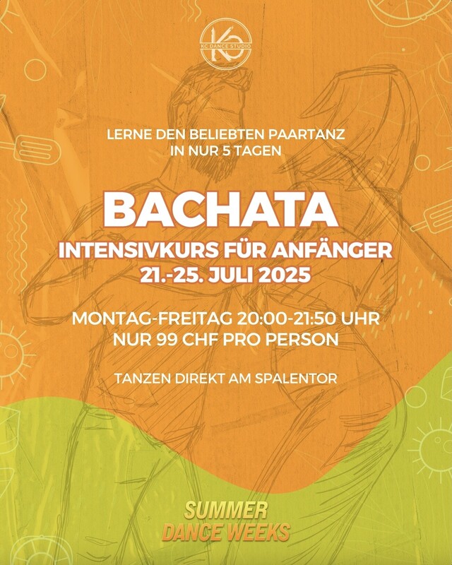 🇩🇪 Tauche ein in die Welt der Bachata mit dem Intensivkurs für Anfänger Kursdauer: 5 Lektionen á 110 min an 5 Tagen ➡️ Bachata: 21-25 Juli 2025 - 20.00-21.50 Uhr Hier anmelden: https://www.eversports.ch/e/course/e0rYWak Entdecke die Grundlagen der Bachata oder frische deine Kenntnisse auf, indem du an unserem Intensivkurs im KC Dance Studio am Spalentor in Basel teilnimmst. Nach einer intensiven Woche voller Tanz absolvierst du das Beginner Level und erlebst den nahtlosen Übergang in unseren Improver-Kurs. Tanze eine Woche lang intensiv mit professionellen Instruktoren, lerne neue Leute kennen und genieße das karibische Flair. Die Anmeldung ist auch ohne Tanzpartner möglich. Sei dabei und starte dein Bachata-Abenteuer.  🇬🇧 Dive into the enchanting world of Bachata with our Beginner Intensive Course Course duration: 5 lessons of 110 minutes each over 5 days ➡️ Bachata: 21-25 July 2025 - 20.00-21.50 Sign up here: https://www.eversports.ch/e/course/e0rYWak Explore the core elements of Bachata or polish your skills with our intensive program at KC Dance Studio, situated at Spalentor in Basel. After a week packed with dance sessions, you will successfully complete the Beginner level and seamlessly transition to our Improver course. Engage in a week-long immersive dance experience with expert instructors, make new connections, and bask in the vibrant Caribbean ambiance. Registration is open to solo participants as well. Come join us and start your Bachata journey. https://kcdancestudio.com/summerdanceweeks/