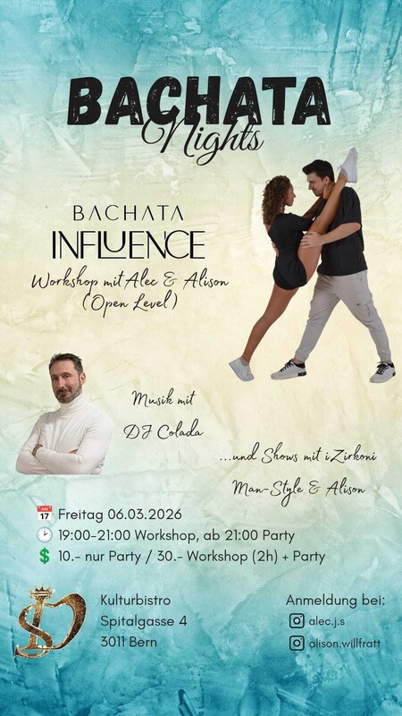 🎶 Freitagtag – BACHATA NIGHTS 🤸 Workshop: 19:00 - 21:00 Bachata Influence Workshop mit Alec & Alison (Open Level) 🕘 Party: ab 21:00 🎚️ Mit DJ Colada 🪩 Show: Premiere I Zirkoni (Man Style) & Show mit Alison Poledance 📍 Kulturbistro 💰 Eintritt: Nur Party 10.- / Workshop (2h) + Party 30.- https://www.salsaluca.ch/