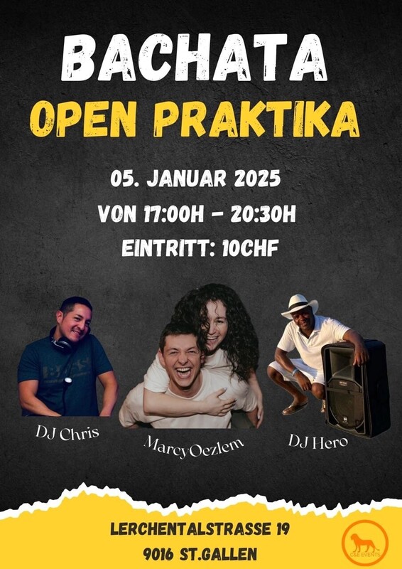 🎉 Sunday Bachata Open Praktika 🎶 Datum & Uhrzeit: 📅 Sonntag, 05. Januar 2025 🕔 Party: 17:00 - 20:30 Ort: 📍 Pivot Lerchentalstrasse 19, 9016 St. Gallen, Schweiz 👉 17:00 - 20:30 Party Preis: 💃 🕺 Party: 10 CHF Highlights: •Eine energiegeladene Party mit den besten Bachata-Beats mit DJ Chris 🎶 Wir freuen uns auf euch!!! Weitere Informationen: C & E Events GmbH Phone 078 209 93 31 https://ce-events.ch