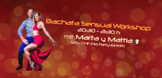 Bachata Sensual Workshop mit Marta y Mattia aus Italien inkl. Party-Ticket für Fiesta Pasión Lerne neue Bachata Sensual Figuren mit Marta y Mattia (@emme_crew) und tanze diese gleich anschliessend an der Fiesta Pasión ab 21:30 Uhr, u.a. Bachata-Floor mit DJ Desea! Workshop inkl. Party-Eintritt für 25.- CHF Abendkasse oder Vorverkauf via Eventfrog: https://eventfrog.ch/de/p/kurse-seminare/musik-tanz/bachata-workshop-mit-marta-y-mattia-ita-7180671860480086100.html