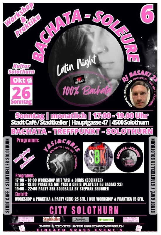 Liebe Tanzbegeisterte (❤️ WE LOVE BACHATA - SOLEURE ) Herzlich Willkommen zu BACHATA - SOLEURE», deinem Treffpunkt für die monatlichen Bachata Events im reizenden Stadtkeller Solothurn, in der atemberaubenden City von Solothurn. Im charmanten Ambiente des Stadt Cafés / Stadtkeller in Solothurn laden wir euch zu einem unvergesslichen Abend voller Romantik, Leidenschaft und Rhythmus ein.💃🕺♥️. Das Vorprogramm an diesem Abend wird ein Anfängerworkshop Bachata Sensual mit Frauenpower (Yasi & Stephanie) sein 17-18 Uhr! Im Anschluss folgt ein Praktika 18-19 Uhr wo wir die gelernte Choreo nochmals festigen und einfach versuchen zur Bachatamusik zu tanzen 💃🕺♥️! Das Highlight des abends ist dann von 19-22:30 Uhr die supercoole SBK von Stephan mit Solobaila und DJ Esteban 💃🕺😎. Dieser Event ist für alle welche Bachata ausprobieren möchten, für Anfänger und Tanzerfahrene gleichermassen ideal! Falls ihr also Bekannte, Freunde und Kollegen habt, welche gerne Bachata ausprobieren oder bereits Tanzerfahrene kennt, unbedingt dabei sein. Wir freuen uns 💃🕺♥️! https://einfachspass.ch
