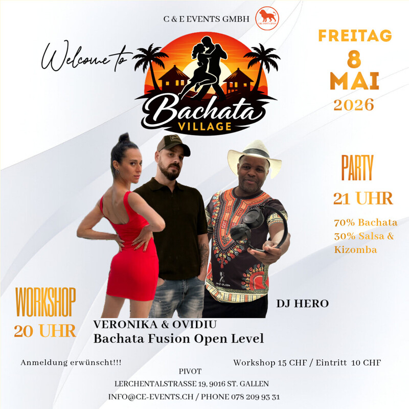 ✨ Seid dabei, wenn wir gemeinsam die erste Bachata Village Party in St. Gallen feiern! Am Samstag, 08. Mai im Pivot St. Gallen 🔥 Erste Bachata Village Party in St. Gallen 🔥 🕗 20:00 Uhr – Bachata Workshop mit Veronika & Ovidiu (Open Level) 🎧 Party ab 21:00 Uhr mit DJ Hero 70% Bachata • 30% Salsa & Kizomba 💰 Preise 1 Workshop: CHF 15 Eintritt Party: CHF 10 📩 Anmeldung erwünscht 💳 Zahlung: Twint oder Cash ❗ Keine Kartenzahlung möglich 📞 Workshop Anmeldung & Infos Phone: 078 209 93 31 Mail: info@ce-events.ch 🚗 Parkplätze Parkplätze direkt vor dem Haus sowie an der Lerchentalstrasse 21 beim Stoffwechselzentrum (Gästeparkplätze). Weitere Gästeparkplätze auf dem Kiesplatz bei Altrimo & Stoffwechselzentrum. ✨ Wir freuen uns auf einen schönen Abend mit euch! 💃🕺 www.ce-events.ch