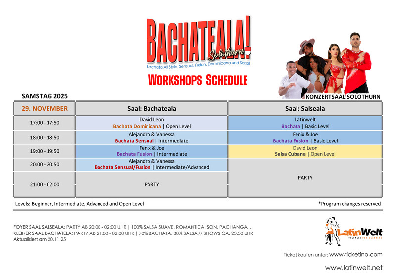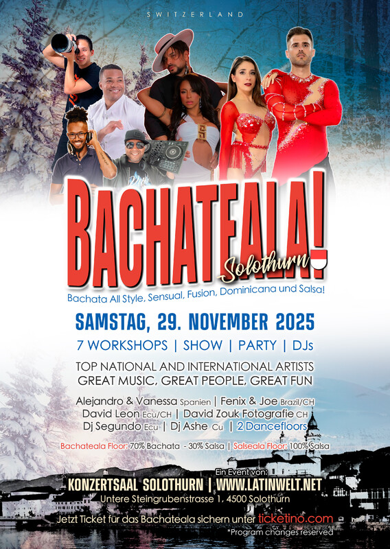BACHATEALA WORKSHOPS | PARTY | SHOWS | 2 DANCEFLOORS | DJs Herzlich Willkommen zu einer weiteren Bachateala Edition in der schönsten Barockstadt der Schweiz, in Solothurn. Es erwarten Euch Workshops mit nationalen und internationalen Instruktoren und ein Abend mit Shows und Animation. Wir freuen uns auf ein Weekend voller Freude, Spass und heissen Rhythmen im wunderschönen Konzertsaal in Solothurn SAMSTAG 29.11.2025: 2 DANCEFLOORS: 1. Floor Saal Bachateala: 70% Bachata All Style! // 30% Salsa 2. Floor Saal Salseala: 100% Salsa All Style! ★ ARTISTEN & INSTRUKTOREN: Alejandro & Vanessa 🇪🇸 Fenix & Joe - 🇧🇷🇨🇭 David Leon - 🇪🇨🇨🇭 und mehr! ★ DJs: Dj Segundo 🇪🇨🇨🇭 Dj Ashe ★ FOTOS: David Zouk Baselportraits 🇨🇭 ★ ZEITPLAN: Samstag, 29. November 2025 Aktualisier am 19.09.2025 17:00 - 21:00 Uhr // Workshops 20:00 - 01:00 Uhr Party auf 2. Floor 21:00 - 02:00 Uhr Party auf 1. Floor 23:30 Uhr Shows 02:00 Uhr Partyende ★ PREISE VORVERKAUF: FRÜHBUCHERRABATT Fullpass CHF 70.- (Inclusive All Workshops and Party) Pärchen Fullpass CHF 130 ( 2 Fullpasse) Partypass + 1 Workshop CHF 30.- Partypass + 2 Workshops CHF 50.- Partypass + 3 Workshops CHF 60.- Partypass Samstag CHF 15.- bis... 29.11.25 um 18:00 Uhr ★ PREISE ABENDKASSE: FULLPASSE CHF 80.- FULLPASS // Workshops, Partys // Sa 1 Workshop + Party CHF 35.- 2 Workshops + Party CHF 60.- 3 Workshops + Party CHF 70.- Samstag Partypass* CHF 18.- ★ WEITERE INFORMATIONEN Garderobe Gratis 10 Minuten zu Fuss vom Hauptbahnhof Verschiedene Parkmöglichkeiten, z.B. Parkhaus Baseltor 5 Minuten, Parkhaus Bieltor 3 Minuten. ★Adresse: Konzertsaal, Untere Steingrubenstrasse 1, 4500 Solothurn *Programmänderung vorbehalten *Program changes reserved https://www.latinwelt.net/p/bachateala_14.html