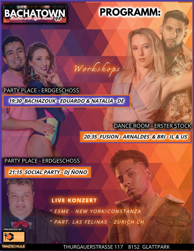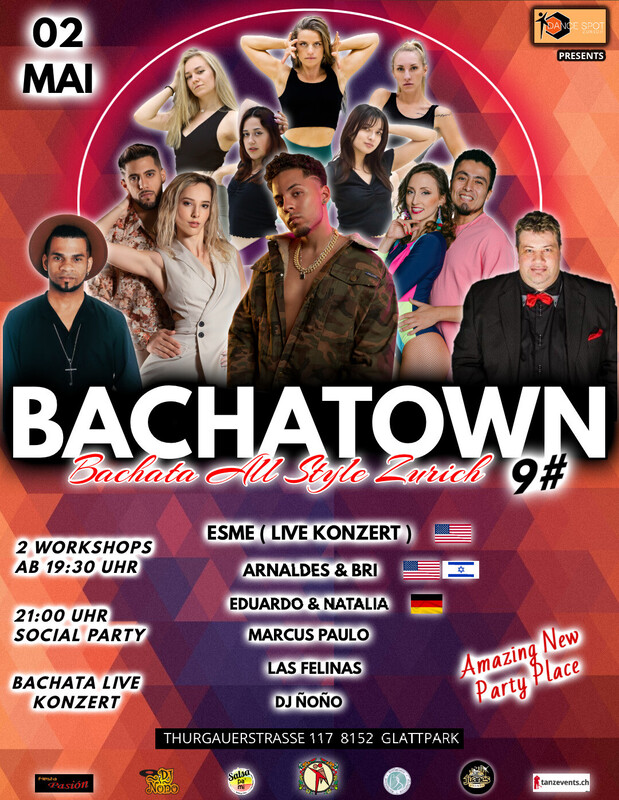 WIR FREUEN UNS, UNSER WUNDERSCHÖNES NEUES PARTY LOKAL UND NEUE EVENT STRUKTUR ZU PRÄSENTIEREN! Bei diesem Event, welches, immer am ersten Freitag jedes zweiten Monats stattfindet, wird zu 100% Bachata gespielt. LINE UP: • Esme 🇩🇴 🇺🇲 • Arnaldes & Bri 🇮🇱 🇺🇲 • Eduardo & Natalia 🇲🇽 🇩🇪 • Las Felinas 🇨🇭 • Marcus Paulo 🇨🇭 • DJ Ñoño 🇨🇭 Besonders die nationalen und internationalen Artisten und DJs machen diese Eventreihe zu einem einzigartigen Erlebnis. Die DSZ Tanzschule ist darauf bedacht, aktuelle, relevante und vor allem qualitative Lineups für euch vorzubereiten. __________________________________________ PROGRAMM: • Türöffnung 19:00 WORKSHOPS • Raum A (Erdgeschoss) 19:30 - 20:30 - BACHATA SENSUAL by Eduardo & Natalia 🇲🇽 🇩🇪 • Raum B (1. Stock) 20:30 - 21:30 - BACHATA FUSION by Arnaldes & Bri 🇮🇱 🇺🇲 ____________________________________ ★ 21:00 - SOCIAL PARTY TIME - ERDGESCHOSS Musik 100% Bachata All Style mit DJ Ñoño ____________________________________ ★ SHOWTIME: • Eduardo & Natalia • Esme Konzert (feat Las Felinas) ___________________________________ 📌 LOKAL: Dance Spot Zurich Thurgauerstrasse 117, 8152 Zürich TMC Fashion Gebäude ____________________________________ WORKSHOP PASS LINK: https://eventfrog.ch/bachatown9workshops PARTY PASS LINK: https://eventfrog.ch/bachatown9party ________________________________ FACEBOK EVENT LINK: https://www.facebook.com/share/1AF4kVbH6B/ INSTAGRAM: @bachatown.zurich