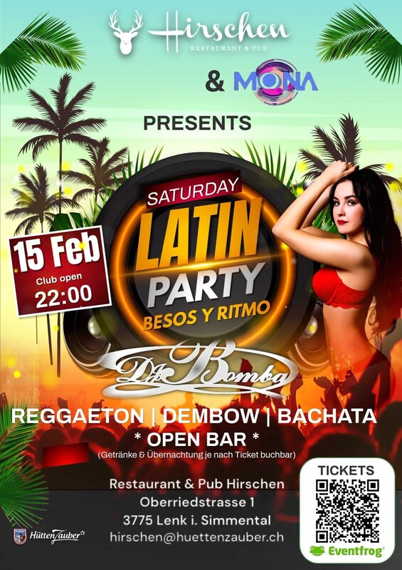 LATIN FEVER & OPENBAR AT LENK Erlebe die erste echte Latin Party im Simmental, die dich in eine Welt voller heisser Rhytmen und unvergesslicher Momente entführt! Am 15.Februar 2025 sorgt der berner DJ BOMBA mit den besten Hits aus Reggaeton, Dembow und Bachata für eine mitreissende Atmosphäre, die dich garantiert nicht stillstehen lässt. Mit deinem Ticket profitierst du von einer Open Bar, die dich die ganze Nacht mit erfrischenden Drinks versorgt. Zudem gibt es eine Übernachtungsmöglichkeit für CHF 25.00 an der Lenk, solltest du nicht mehr fahren können oder wollen (Bitte Schlafsack mitbringen). Freu dich auf eine feurige Partynacht, in der es nicht nur Musik, sondern noch vieles mehr gibt- pure Leidenschaft, tropische Vibes und jede Menge Spass ist garantiert! Sicher dir JETZT dein Ticket und sei dabei, wenn die Lenk bebt! WIR FREUEN UNS AUF DICH!! -------------------------------------------------------------------------------------------------------- FIEBRE LATINA & OPENBAR EN LENK Viva la primera auténtica fiesta latina en Simmental, que le transportará a un mundo lleno de ritmos calientes y momentos inolvidables. El 15 de febrero de 2025, el DJ bernés BOMBA creará un ambiente endiablado con los mejores éxitos del reggaeton, el dembow y la bachata que te garantizará que no pares de moverte. Con su entrada, se beneficiará de una barra libre que le proporcionará bebidas refrescantes durante toda la noche. También hay alojamiento disponible en Lenk por 25,00 CHF si no puedes o no quieres conducir (por favor, trae un saco de dormir). Te espera una noche de fiesta ardiente en la que no sólo habrá música, sino mucho más: ¡pura pasión, vibraciones tropicales y mucha diversión garantizada! ¡Consigue tu entrada AHORA y estate allí cuando Lenk se estremezca! ¡TE ESPERAMOS! https://eventfrog.ch/de/p/party/latin-brasil/besos-y-ritmo-7289580107773014682.html
