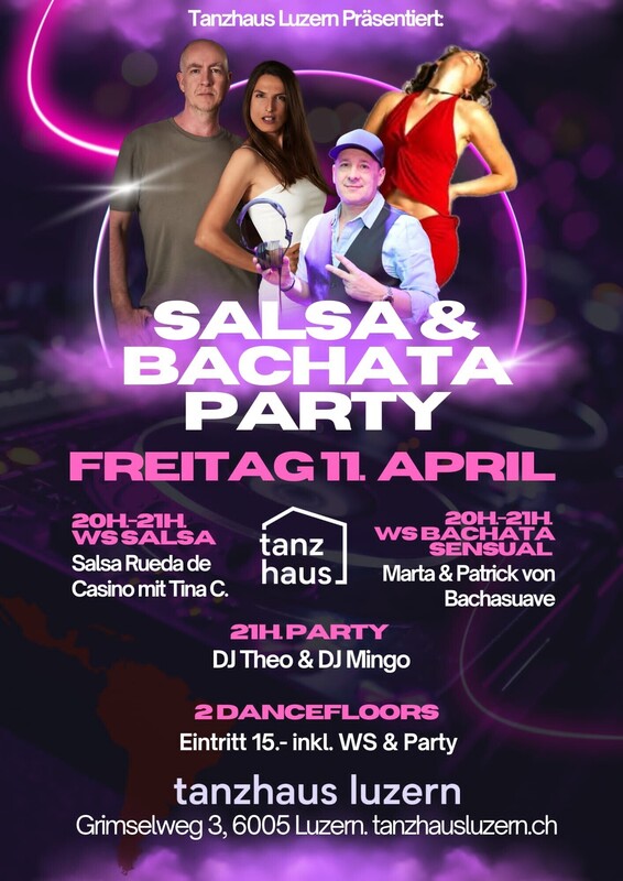 Tanzhaus Luzern Präsentiert ★ FREITAG 11. APRIL ab 20h. "Hauspartys" BIG Salsa & Bachata Party auf 2 Tanzflächen ★ 20h.-21h. WORKSHOP SALSA Anfänger Salsa Rueda de Casino (Kubanischen Stil) mit Tina Colatrella. ★ 20h.-21h. WORKSHOP BACHATA SENSUAL Marta & Patrick von Bachasuave ★ MAIN FLOOR Salsa 100% mit DJ Theo ★ 2ND FLOOR Bachata 100% mit DJ Mingo Eintritt CHF 15.- inklusive 2 Workshops & Party TANZHAUS LUZERN Grimselweg 3, 6005 Luzern www.tanzhausluzern.ch https://fb.me/e/8xSadZuu0