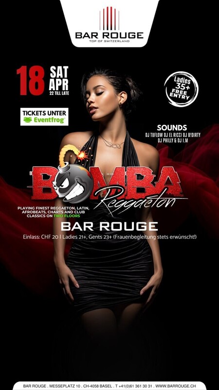 Am Samstag, den 18. April 2026 startet Bomba Reggaeton in die nächste Runde auf 105 Meter in der Bar Rouge. Beim Take Off mit an Bord sind die DJs El Ricci, Tuflow, B!Dirty, I.M. und Philly. Das Ganze gehostet von zwei der erfahrensten Veranstaltern von Basel; Bar Rouge & Bomba Reggaeton. https://eventfrog.ch/Bomba-Reggaeton18042026