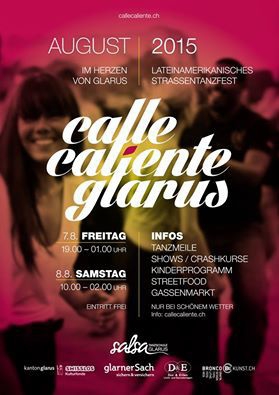 das 2-tägige festival, wo man sich trifft, tanzt und ausgelassen feiert. mit live musik, djs und vielen acts feiern wir den sommer in der stadt. komm auch und erlebe mit uns das einzigartige tanzspektakel im Herzen von Glarus. http://www.callecaliente.ch/ SAMSTAG 08/08/15 STRASSENTANZFEST Ab: 10:00 mit Dj Alfredo Lopez aus Peru fitness caliente ! - powerdance mit jessy - jumping workout mit alex araujo 12:00 streetfood / littel market 13:00 - 17:00 spiel und spass mit kinderkrippe glarus 14:00 jumping workout mit alex araujo 15:00 jessy's power dance for kids - show und animation 16:00 tanzwerk glarus-zürich - anya und neva fischli - Ab 16:30 mit Dj Geovanni aus Domenikanische Reppublik -shows und Crashkurse -orientalischer bauchtanz mit nassim -salsa, rueda de casino mit salsa tanzschule Glarus 16:30 - 17:30 poledance workshop mit diamond polefitness 19:00 rueda salsa glarus show und Animation dj-team - aurelio el padrino - yosley palma - duke garcia 19:30 tanzwerk glarus-zürich - anya und neva fischli - Ab 20:00 Dj Aurelio aus Cuba 20:00 rueda show und animation - chevere salsa chur 21:00 orientalisches feuerwerk - nassim 21:30 poledance show - lian 22:00 caliente salsa show - jessy y fabio 22:00 grupo tiempo y manana - cu/it 1. set 23:00 salsa show und animation - marakuya dance company st. gallen 23:30 grupo tiemo y manana - cu/it 2. set 24:00 - 02:00 party