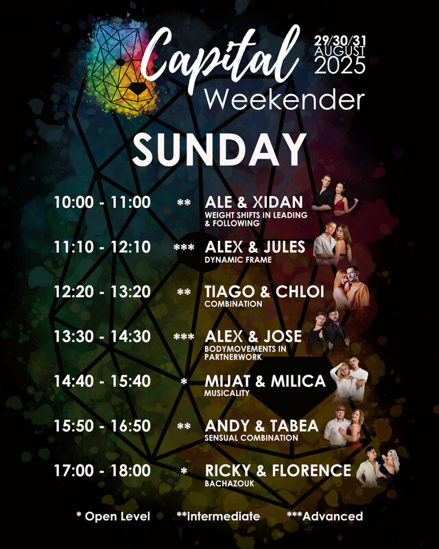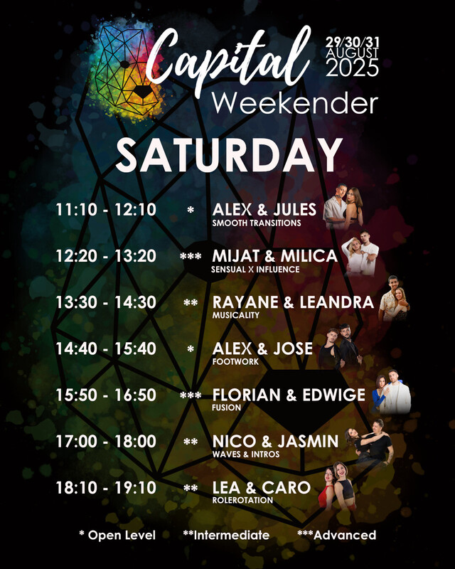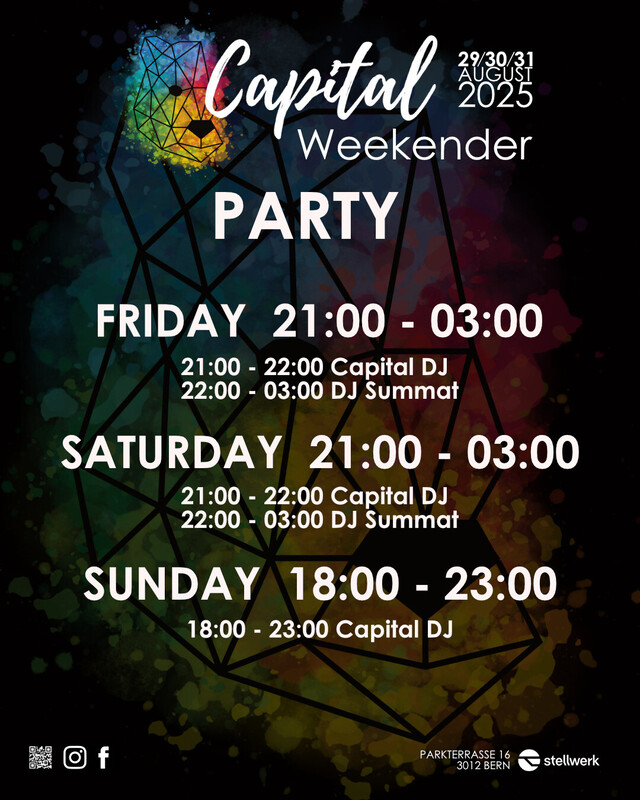 ✨ CAPITAL WEEKENDER ✨ 29. - 31. AUGUST 2025 ✨ Join us for an unforgettable weekend full of Bachata in the picturesque Capital of Switzerland. We will have 3 nights of dancing and 2 full days of workshops with international and national artists. Pack your dancing shoes and your favourite outfits and be ready to create memorable moments with our Bachata family and maybe even meet your new dance crush? SCHEDULE Friday: - 21:00 - 03:00 Bachata Party Saturday: - 11:10 - 19:10 Workshops for different levels - 21:00 - 23:00 Bachata Party Sunday: - 10:00 - 18:00 Workshops for different levels - 18:00 - 23:00 Bachata Party INTERNATIONAL ARTISTS 💖 Alex & José (Cádiz) 💖 Florian & Edwige (Lyon) 💖 Jules & Alex (Graz & Madrid) 💖 Mijat & Milica (Belgrad) 💖 Ricky & Florence (Freiburg) NATIONAL ARTISTS 💖 Ale & Xidan (Zurich) 💖 Andy & Täbi (Bern) 💖 Nico & Jasmin (Basel) 💖 Ryan & Leandra (Zurich) 💖 Tiago & Chloi (Geneva & Zurich) DJs 🎵 DJ Summat 🎵 DJ Fabian & Lara SHOWS 🌟 Andrea Gabriela 🌟 BaiLarEqui WORKSHOPS We will have 7 workshops a day with our amazing artists where you will be able to take your bachata to the next level! 🔥 There will be Improver, Intermediate and Open level workshops focusing on different skills to improve your social dancing, all while having an amazing time! 🥳 To help us balance attendance, please buy a follower or leader pass depending on the role you want to learn the most in the workshops. MASTERPASS Are you looking for Advanced level Bachata Workshops? We got you! Join our exclusive Masterclasses! You will get 3 or 6 Masterclasses with our top teachers where you can benefit from individual feedback and a small and advanced group of only 10 couples. 🤩 You can buy a Masterpass for Saturday and/or Sunday (3 Masterclasses per day, 90 minutes each). The Early Bird price for a Masterpass is 150.- for one day and 230.- for both days. The Party Pass is included in each Masterpass.💃🏻 To ensure that all participants are advanced dancers an application is required. To get your pass send your video to bachata.bcb@gmail.com. Very limited spots, so be quick! 🚀 Important: The video should be of you dancing Bachata (Social dance, no choreography or demo) to a full song with a partner. LOCATION The venue is located directly above the main train station in Bern. You can take the elevator from the passage underneath the platforms up to the 3rd floor, turn right and walk around the corner to the dancefloor. 📍 Stellwerk Bern, Parkterrasse 16, 3012 Bern, Switzerland FOOD & DRINKS The Stellwerk Bistro offers a variety of delicious food and refreshing drinks! Our favorites are the Outlawz Kebab and the Matcha Grapefruit drink! 😍 Follow Capital_Bachata&Kizomba on Instagram to stay up to date! We look forward to dancing with you! 💕 Your Capital Team 🐻 By attending in the workshops and parties, you agree to the publication of photos/videos of the event for promotional purposes. https://eventfrog.ch/de/p/party/latin-brasil/capital-weekender-2025-7324859999963866677.html