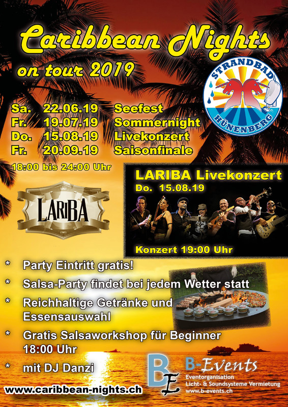 Caribbean Nights on tour in der Badi-Beiz Strandbad Hünenberg ► Party: Gratis Eintritt für ALLE ► Findet bei jedem Wetter statt ► mit gratis Salsaworkshop für Beginner ► Für die Musik: DJ Danzi ► Ort: Badi Beiz / Strandbad Hünenberg ► Organisator: B-Events ► Gastgeber: Reto & Badi-Beiz ► alles weitere unter http://www.caribbean-nights.ch ----------------------------------------------------------------------- ☆ ★ ☆ Weiterer Caribbean-Nights: ☆ ★ ☆ http://www.caribbean-nights.ch http://www.caribbean-nights.ch