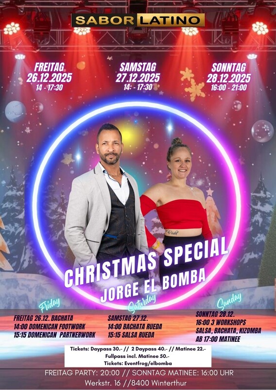 🎄 Christmas Special mit Jorge El Bomba – 26.–28. Dezember 2025 Sabor Latino Winterthur Erlebe drei unvergessliche Tage voller Bachata, Salsa, Rueda und Christmas-Vibes! Für dieses exklusive Christmas Special kommt Jorge El Bomba – internationaler Bachata-Star & Salsa-Profi – zu uns nach Winterthur. Unterstützt wird er von Nina, die euch mit viel Energie, Technik und Präzision durch die Workshops führt. Ob Mittelstufe oder erfahrene Tänzer: Dieses Wochenende bietet dir neue Moves, intensive Workshops und eine einzigartige festliche Stimmung – perfekt zum Jahresabschluss. ✨ Highlights ⭐ 3 Tage Workshops: Bachata Dominicana, Rueda, Salsa Rueda 💃 3 Christmas Workshops am Sonntag (Salsa, Bachata, Kizomba) 🎉 Party am Freitag & Matinee-Party am Sonntag 🎁 Exklusives Wochenende mit Jorge El Bomba 🔥 Perfekte Mischung aus Technik, Style & Social Dancing 📅 Programm Freitag, 26.12.2025 – 14:00–16:30 Bachata Dominicana Special 14:00 Bachata14:00 Dominican Footwork 15:15 Dominican Partnerwork ➡️ Party am Abend: 20:00 Uhr Samstag, 27.12.2025 – 14:00 –16:30 14:00 Bachata Rueda 15:15 Salsa Rueda Sonntag, 28.12.2025 – 16:00–23:00 Christmas Matinee Special 16:00–17:00 Workshops: Salsa, Bachata, Kizomba Ab 17:00 Matinee-Party 🎟️ Tickets Daypass: CHF 30.– 2-Daypass: CHF 40.– Matinee: CHF 22.– Fullpass inkl. Matinee: CHF 50.– 🌟 Warum du dabei sein solltest Dieses Christmas Special ist die perfekte Gelegenheit, zwischen den Festtagen Energie zu tanken, Neues zu lernen und mit der Community zu feiern. Top-Workshops, authentische karibische Energie und ein einzigartiger Jahresabschluss – verpasse es nicht! eventfrog.ch/elbomba