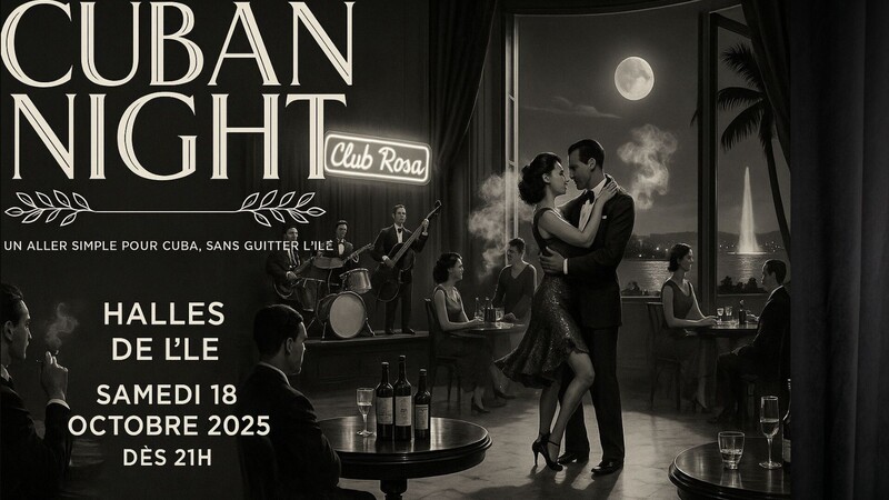 🎉 CUBAN NIGHT - Soirée salsa 100% Cubana 📍 Les Halles de l’île – Place de l’île 1, 1204 Genève 🗓️ Samedi 18 octobre 2025 🕗 Initiation gratuite à la salsa cubaine : 20h–21h 💃 Soirée : 21h–2h 💸 Entrée : 15 CHF avant 22h / 20 CHF après 🔥 Un aller simple pour Cuba, sans quitter l’île ! 🔥 Prépare-toi à une soirée 100 % salsa cubaine, festive et ensoleillée, au cœur de Genève 🌴 Que tu sois danseur passionné ou simplement curieux de découvrir l’ambiance cubaine, viens profiter d’un lieu unique, des cocktails, d’une atmosphère chaleureuse et d’une musique qui donne envie de bouger dès les premières notes 💃🕺 👉 Initiation gratuite à la salsa cubaine dès 20h pour se mettre dans le rythme 👉 Soirée dansante de 21h à 2h 👉 Bar et restauration sur place