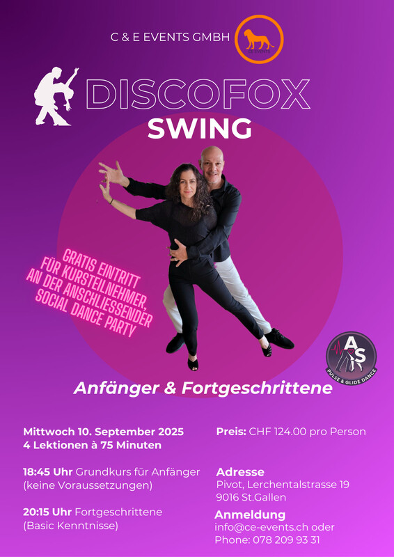 NEUER KURS IN ST.GALLEN!!! Pulse & Glide – Dein Tanz, Dein Moment! Ausdrucksstark mit Charakter und Dynamik – Elegance in Balance. 💃 Über 25 Jahre Tanzerfahrung, Weltmeister 2003 und absolute Leidenschaft für Discofox & Swing – wir bringen dich garantiert in Bewegung! Bei uns zählt nicht nur die Figur, sondern das Gefühl: • Individuell – Wir gehen auf jedes Paar persönlich ein. • Technisch clever – Führungstechnik von der ersten Minute. • Alltagstauglich – Schritte, die wirklich jeder tanzen kann. 🎵 Musik verstehen, Geschichte erzählen Musikinterpretation ist der Schlüssel: Wer den Rhythmus spürt, tanzt nicht nur im Takt – er lebt ihn. 😄 Locker, spielerisch, effektiv Mit smarten Techniken und jeder Menge Spaß kommst du schneller ans Ziel – egal ob Anfänger, Profi oder Privatstunden-Fan. ✨ Komm vorbei – entdecke Dynamik, Rhythmus und pure Freude am Tanzen! Kurs: 4x 1 1/4 Std. Kosten: 124 CHF Kurs nur mit Voranmeldung unter: info@ce-events.ch oder Phone 078 209 93 31 Wir freuen uns auf schöne Kursstunden mit euch!!! Mittelstufen Kurs kann man jederzeit einsteigen!!! www.ce-events.ch