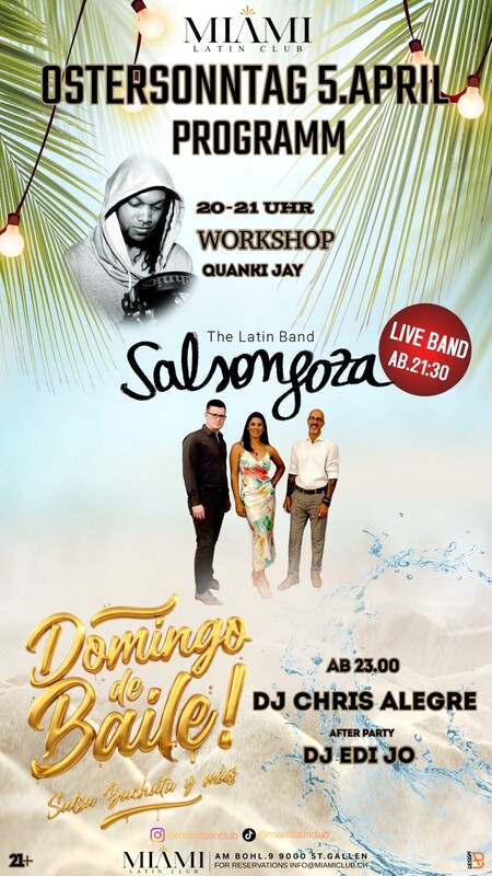 🌴💃 DOMINGO DE BAILE! – Salsa, Bachata y más | Ostersonntag im Miami Latin Club 🕺🌴 Beschreibung: 🔥 Domingo de Baile! – Der Ostersonntag wird heiss! 🔥 Am 5. April verwandelt sich der Miami Latin Club in St. Gallen in das Herz Lateinamerikas! Feiere mit uns den Ostersonntag so, wie er gefeiert werden sollte – mit Live-Musik, heissen Rhythmen und purer Leidenschaft auf der Tanzfläche! 💃🕺 🎶 LIVE BAND: Salsongoza 🎶 Die Latin Band Salsongoza bringt euch LIVE die feurigsten Salsa- und Latin-Klänge direkt auf die Bühne! Echte Instrumente, echte Energie, echtes Feeling – das wird ein Abend, den ihr nicht vergessen werdet! 🎧 DJ CHRIS ALEGRE Nach der Live-Band übernimmt DJ Chris Alegre die Decks und sorgt mit den besten Salsa-, Bachata- und Latin-Hits dafür, dass die Tanzfläche nicht stillsteht! 🎉 AFTER PARTY mit DJ EDI JO Und wenn ihr denkt, der Abend ist vorbei? Falsch gedacht! DJ Edi Jo heizt euch bei der After Party nochmal richtig ein – bis in die frühen Morgenstunden! 🎓 WORKSHOP mit Juanqui Jay Ihr wollt eure Moves verbessern oder seid noch Anfänger? Kein Problem! Juanqui Jay gibt euch einen exklusiven Workshop, damit ihr auf der Tanzfläche glänzen könnt! 📋 Alle Infos auf einen Blick: 📅 Wann: Ostersonntag, 5. April 2026 ⏰ Ab: 20:00 Uhr 📍 Wo: Miami Latin Club, Am Bohl 9, 9000 St. Gallen 🎵 Line-Up: 🎤 Live Band – Salsongoza 🎧 DJ Chris Alegre 🎧 DJ Edi Jo (After Party) 💃 Workshop – Juanqui Jay 🔞 Alter: 21+ 📩 Reservationen: info@miamiclub.ch