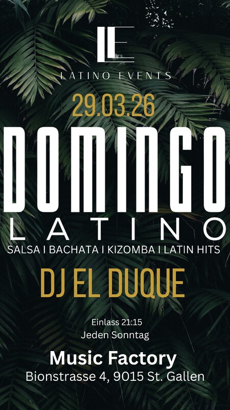 ‼️‼️ Domingo Latino ‼️‼️ #SALSEROSSILLAMANYOVENGO 🎵🎶 #ESOOOO 💃🕺 #ABAILAR LOCATION: tanzen wir jeden Sonntag im Rooftop der Music Factory 📍 Bionstrasse 4, 9015 St. Gallen (4. Stock mit Lift) 🚌 Bus: St. Gallen Russen | Altenwegen 🚗 Gratis Parkplatz – Tiefgarage (2UG/3UG) & Aussenparkplätze 💃 300 m² Dancefloor | Rooftop Vibes | Neue Energie Wie immer erwarten euch das Latino Events Team und unsere Resident DJs mit Salsa, Bachata & Kizomba in einem einmaligen Ambiente ! 🗓 Jeden Sonntag ab 21:15 Uhr Bringt eure Freunde mit und macht den Sonntag zum Highlight der Woche! Domingo Latino – die Party, die euch den Montag vergessen lässt ❤️🔥 #bachata #latinamericandance #salsacubana #salsabachata #kizombaaddict #latino #salsadancing #socialdance #DomingoLatino #fiestalatina