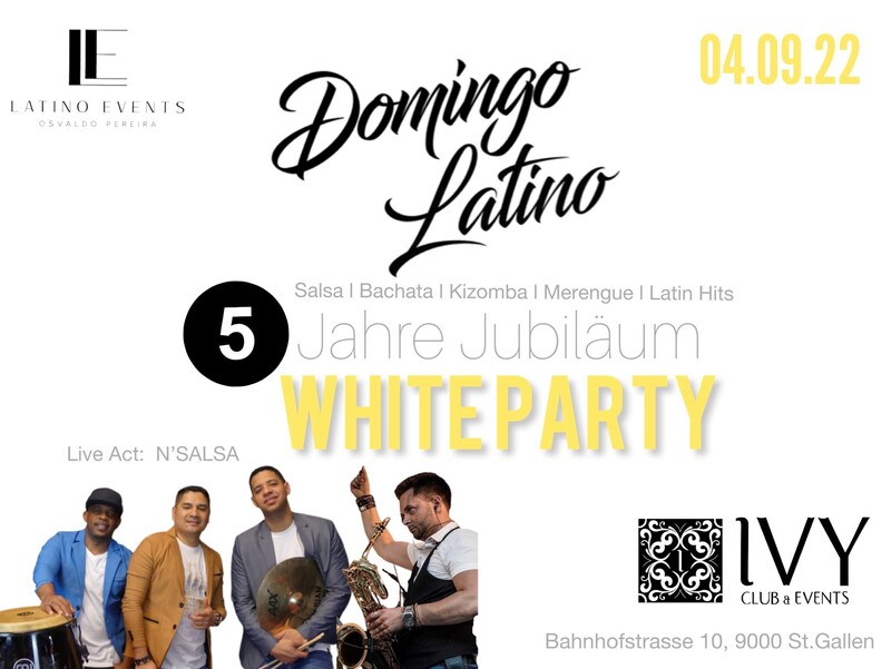 Liebe Freunde und Gäste Wir freuen uns sehr, am 4. September 2022 mit euch das 5-jährige Jubiläum von Domingo Latino zu feiern! Als Special Act wird die Latino Band „N‘Salsa“ mit ihrer lebendigen Musik und ihren energiegeladenen Rhythmen die Stimmung aufheizen. Kommt vorbei und feiert mit uns, denn wir haben es auch euch zu verdanken, das 5-jährige Jubiläum feiern zu dürfen. Als Dankeschön bieten wir euch gerne einen leckeren Apéro an. Kommt vorbei und geniesst einen tollen Abend! Porque la vida es más bella bailando… Wir freuen uns auf euch! Euer Domingo Latino Team