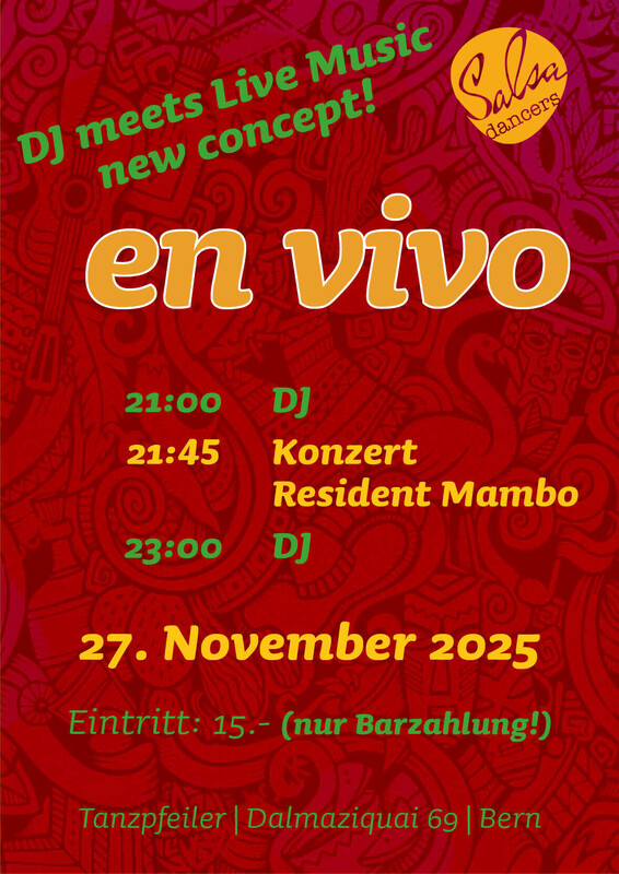 en vivo – Konzert mit Resident Mambo! ✨ 🔥 Wann? Jeden letzten Donnerstag im Monat 📍 Wo? Im Tanzpfeiler Salsadancers Erlebe einen Abend voller Leidenschaft und Rhythmus! 💃🎶 Die Party „en vivo“ bringt Musiker:innen und Tänzer:innen zusammen und entführt dich mit Live-Musik in die Welt von Son, Salsa und Latin Jazz. 🎷🥁🎸 ✨ Warum du dabei sein solltest? Einzigartige Live-Bands und Musiker:innen Grenzenlose Improvisation und Inspiration Die perfekte Mischung aus Musik und Tanz Egal, ob du ein erfahrener Tänzer bist oder einfach nur die Atmosphäre genießen möchtest – bei „en vivo“ wird jeder Schritt zum Genuss! 🕺💃 Eintrittspreise: Kleiner Preis: CHF 10.- Richtpreis: CHF 15.- Gönnerpreis: CHF 20.- Zeit: [ab 21:00 Uhr] Teile das Event mit deinen Freunden und lass uns gemeinsam feiern! 🥳