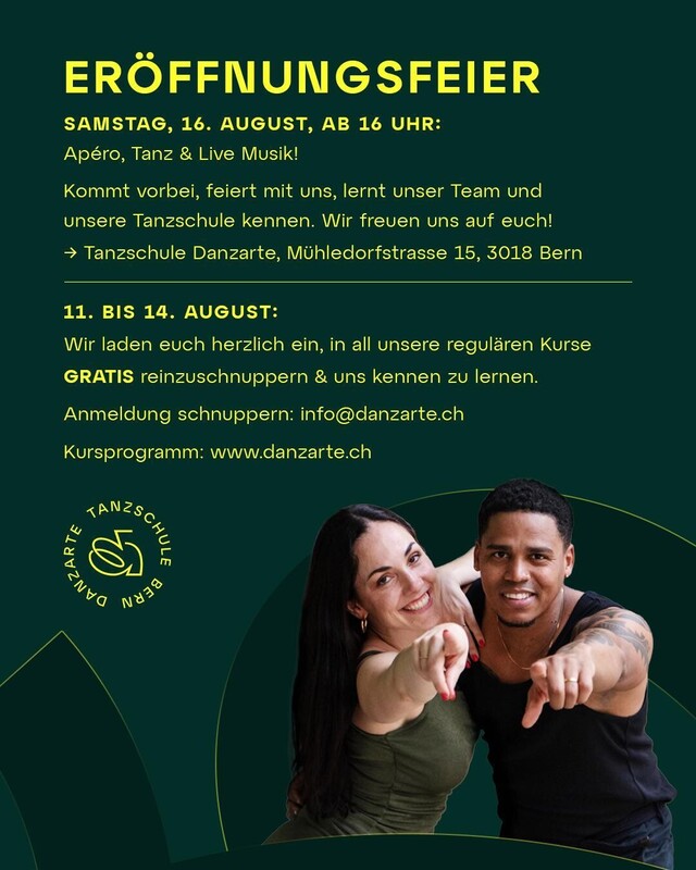 Wir feiern offiziell die Eröffnung unserer Tanzschule - und du bist herzlich eingeladen! Komm vorbei, feiere mit uns, lerne unser Team und unsere Tanzschule kennen. Ein Apero, viel Tanz und immer wieder live Musik, sei es Son cubana, Salsa oder Rumba etc. warten auf dich. Wir freuen uns auf dich! https://danzarte.ch/ https://danzarte.ch/