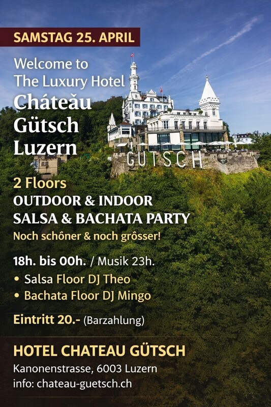 SAMSTAG 25. APRIL 2026 Welcome to The Luxury Hotel Château Gütsch Luzern "2 Dancefloors" OUTDOOR & INDOOR SALSA & BACHATA PARTY Noch schöner & noch grösser! bei schönem Wetter tanzen wir im Schlossgarten und Ballsaal, bei schlechtem Wetter nur im Ballsaal. 18 Uhr bis 00 Uhr - Musik bis 23 Uhr SALSA ALL STYLES - BACHATA ALL STYLES Salsa Floor DJ Theo Bachata Floor DJ Mingo Türöffnung 18:00 Uhr - Eintritt 20.- (Barzahlung) Abends Warme Küche 18 Uhr bis 22 Uhr Für die Reservation im Restaurant Lumières: Tel. 041 289 14 14 oder info@chateau-guetsch.ch HOTEL CHATEAU GÜTSCH LUZERN Mit seiner spektakulären Panoramasicht über die historische Altstadt von Luzern, den Vierwaldstättersee und die Berge, ist der Gütsch weitum bekannt als einer der wohl schönsten Hotelstandorte überhaupt – und das seit mehr als einem Jahrhundert. HOTEL CHATEAU GÜTSCH - 4 Sterne-Hotel Kanonenstrasse, 6003 Luzern Zu wenig Parkplätze vorhanden "BITTE" Die Gütschbahn benutzen - Baselstrasse 21a - 6003 Luzern Für Zimmer, Restaurant, Lounge oder Tisch Reservation Telefon: 041 289 14 14 - Web: www.chateau-guetsch.ch Facebook: https://fb.me/e/69gN07st3