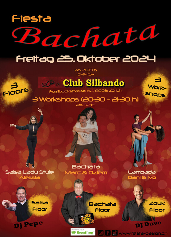 Fiesta Bachata - Deine Social-Dance Party am 4. Freitag des Monates im Club Silbando! Mit 3 Workshops und 3 Floors! Das erwartet dich: *3 Workshops* von 20:30 - 21:30 Uhr (CHF 25.- inkl. Party-Eintritt): - Bachata mit Marc & Özlem - Salsa Lady Style mit Alessia - Lambada mit Dani & Ivo *3 Floors* Party ab 21:30 Uhr (CHF 15.-): - Floor 1: Bachata mit DJ Ñoño - Floor 2: Salsa mit DJ Pepe - Floor 3: Zouk mit DJ Dave Vorverkauf Workshops und Party-Eintritt via Eventfrog: https://eventfrog.ch/de/p/party/latin-brasil/fiesta-bachata-7238920528555096627.html ●●● WHATSAPP/TELEGRAM: Komm in die WhatsApp- oder Telegram-Gruppe und bleibe über die kommenden Events informiert: Whatsapp: https://chat.whatsapp.com/DHgqcB4Pe8aFmjpYt2v03c Telegram: https://www.t.me/fiestapasion ●●● Fiesta Bachata Daten 2024: jeweils am 4. Freitag des Monates 22.11.2024 27.12.2024 ●●● Euer Fiesta Pasion Team www.fiesta-pasion.ch www.fiesta-pasion.ch