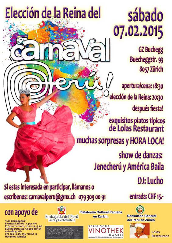 El Comite CARNAVAL PERU los invita a disfrutar de: Platos Tipicos Peruanos con Lola Restaurante, Bebidas Exoticas Danzas Folkloricas con JENECHERU (Bolivia) AMERICA BAILA (Perú) y la buena musica del DJ Lucho. Eleccion de la Reyna del Carnaval que nos representara en el Züri Karneval 2015 y no faltara nuestra HORA LOCA,....