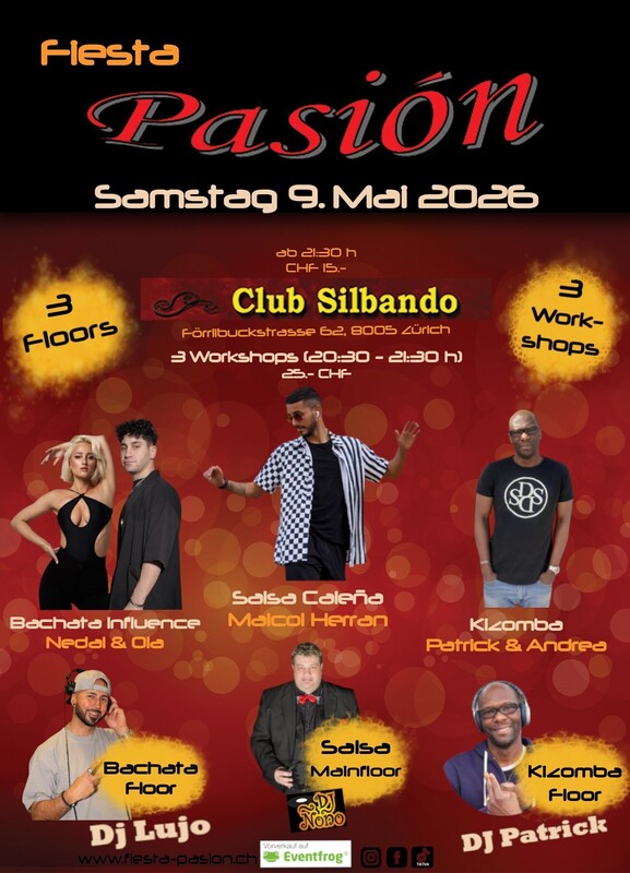 Fiesta Pasión - Deine Social-Dance Party am 2. Samstag des Monates im Club Silbando! Mit 3 Workshops und 3 Floors! Das erwartet dich: *3 Workshops* von 20:30 - 21:30 Uhr (CHF 25.- inkl. Party-Eintritt): - Salsa Cali Fusion mit Maicol Herran (PasoLatino - ZH) Vorverkauf: https://eventfrog.ch/de/p/kurse-seminare/musik-tanz/salsa-cali-fusion-workshop-mit-maicol-herran-pasolatino-7444478876607107154.html - Bachata Influence Workshop mit Nedal & Ola Vorverkauf: https://eventfrog.ch/de/p/kurse-seminare/musik-tanz/bachata-influence-workshop-mit-nedal-ola-7451215456713581107.html - Workshop mit Patrick & Andrea Vorverkauf: https://eventfrog.ch/de/p/kurse-seminare/musik-tanz/kizomba-workshop-mit-patrick-andrea-7444479496479064401.html *3 Floors* - Party ab 21:30 Uhr (CHF 15.-): - Floor 1: Salsa mit DJ Ñoño - Floor 2: Bachata mit DJ Lujo - Floor 3: Kizomba mit DJ Patrick & DJ Paul Abendkasse 15 CHF Vorverkauf Workshops und Party-Eintritt via Eventfrog: https://eventfrog.ch/de/p/partys/latin-brasil/fiesta-pasion-7451217371409202935.html ●●● WHATSAPP/TELEGRAM: Komm in die WhatsApp- oder Telegram-Gruppe und bleibe über die kommenden Events informiert: Whatsapp: https://chat.whatsapp.com/DHgqcB4Pe8aFmjpYt2v03c Telegram: https://www.t.me/fiestapasion ●●● Fiesta Pasión Daten 2026: (jeweils am 2. Samstag des Monates) 13.6.2026 11.7.2026 Sommerpause 12.9..2026 10.10.2026 (19-jähriges Jubiläum) 14.11.2026 12.12.2026 ------------------------------ Dein Fiesta-Pasión Team #salsa #bachata #dance #salsadancing #music #a #salseros #merengue #kizomba #colombia #salsacubana #reggaeton #dancer #salsadance #puertorico #bachatasensual #salsamusic #dancing #musica #hiphop #rumba #salsaromantica #mambo #cuba #dancers #salsaon #venezuela #latino #latindance #love https://eventfrog.ch/de/p/partys/latin-brasil/fiesta-pasion-7451217371409202935.html