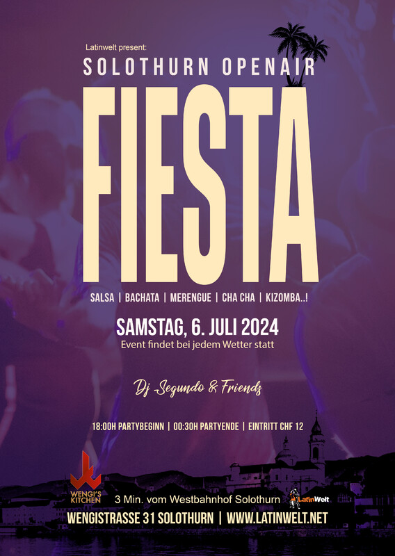 ⚠️ Der Event findet nur bei jeder Wetter statt. 👈🏽 Latinwelt präsentieren: ★FIESTA - OPEN AIR PARTY Dj Segundo & Amigos Salsa, Bachata, Merengue, Reggaeton, Cha cha, Kizomba, Son! Zeit zum Geniessen! Zeit zum Feiern! ★Zeit: 18.00 Uhr bis 00.30 Uhr Party ★Preis: CHF 12.- Eintritt Party ★Informationen: - Der Event finde bei jedem Wetter statt. - 3 Minuten zu Fuss vom Westbahnhof Solothurn - Verschiedene Parkmöglichkeiten weitere Informationen unter www.latinwelt.net Anmeldung nicht zwingend.