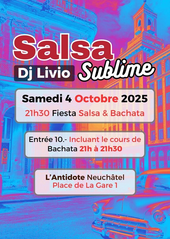 🔥 Fiesta Salsa Sublime 21h30 ★ DJ Livio ★ Antidote Neuchâtel ★ Workshops 🔥 🎶 Les meilleures musiques de salsa & bachata ! 💃 Inclus dans l’entrée 10 CHF : Workshop à 21h00 de 30 min ✨ Boissons rafraîchissantes DE 🔥 Salsa Sublime Fiesta 21:30 ★ DJ Livio ★ Antidote Neuenburg ★ Workshops 🔥 🎶 Die besten Salsa- und Bachata-Hits ! 💃 Im Eintritt von 10 CHF inbegriffen: Workshop um 21:00 Uhr (30 Min.) ✨ Erfrischende Getränke Esteban & L'Antidote