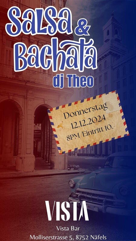 Näfels Donnerstag 12. Dezember SALSA & BACHATA NIGHT Party mit DJ Theo 20.00 Uhr bis 00.00 Uhr - Eintritt 10.- Garderobe Gratis & Genügend kostenlose Parkplätze vorhanden VISTA BAR Molliserstrasse 5 8752 Näfels (Glarus)