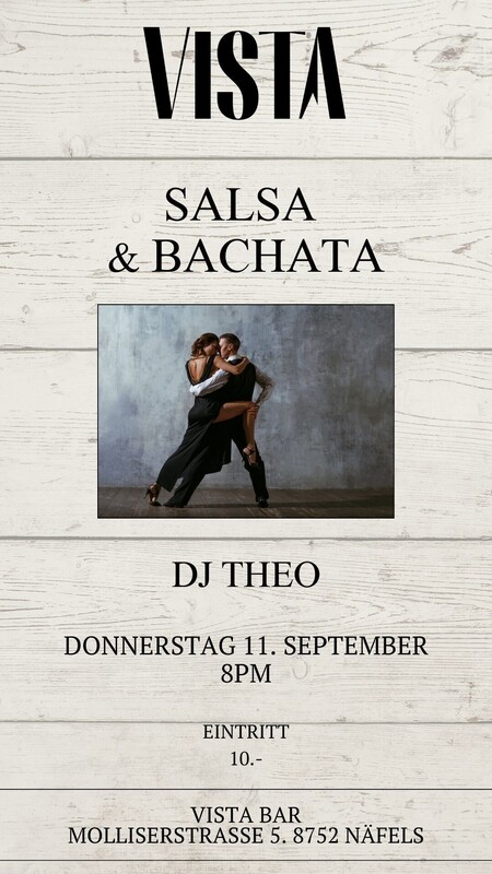 Donnerstag 11. September 2025 SALSA & BACHATA PARTY mit DJ Theo 20.00 Uhr bis 23.55 Uhr Eintritt 10.- Genügend kostenlose Parkplätze vorhanden. VISTA BAR Molliserstrasse 5 8752 Näfels (Glarus) Weitere infos: www.vista-bar.ch https://www.facebook.com/vistabarCH https://fb.me/e/61usoA9Yx