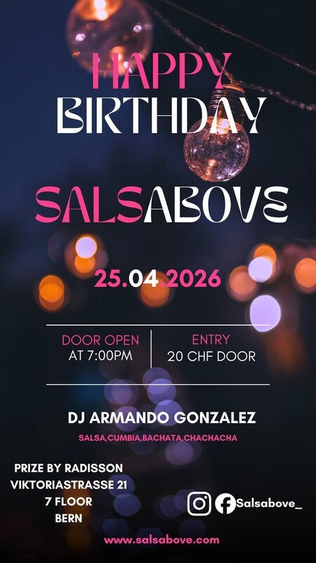 Happy birthday SalsAbove: the Latin american Party on the rooftop of Bern turned 1 year old! Join us for an evening of Latin American music and dance on the rooftop of Bern! Our DJ and teacher will keep you dancing all night long with the best rhythms of salsa, bachata, Cha-Cha-Cha, merengue, and cumbia. Details: - Date: Saturday, 25th April, 2026; - Opening time: 19:00 ; - Location: PrizeHotel Viktoriastrasse 21, 7 floor Bern, 5 minutes by bus (n° 10, stop: Schönbug) from Bern train station; - Safe parking available for 6 CHF all evening ( or blue line's parking around the location); - Rain? No worries, if will rain the party will be held indoors ( during the winter the party will be inside but the terrace will stay open for enjoying the view with a drink and smoking); Contacts: For more information, contact us on Instagram or write to info@salsabove.com Don't miss the chance to dance with us in this exclusive location! Best regards, Andrea from SalsAbove Ps Periodically we organize new parties for our community in other rooftops and locations, for example in the "SalsAbove Last Minute" we'll let know location and time the day before just on Instagram, Fb and on the website. Follow us on IG at this link or for sure you'll lose these parties and discounts on the tickets; www.salsabove.com