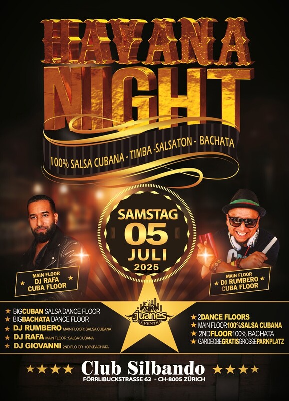 ✪ HAVANA NIGHT ✪ DJ Rumbero DJ Rafa in Club SILBANDO ✪ SAMSTAG 05. JULI 2025 ✪ 2 DANCE FLOORS ✪✪✪ ✪ AB 22 JAHREN ✪ DOORS: 21:30 – 04:00 UHR ✪ EINTRITT CHF 20.- ✪ GRATIS GARDEROBE ✪ 400 AUTO PARKPLÄTZE 2mint VON CLUB ✪ EINTRITT: BEZAHLUNG AN DER KASSE NUR BARGELD ✪ GETRÄNKE-BAR: BARGELD & CREDITCARD ✪✪✪ VERLOSUNG 2X TCIKETS LEONI TORRES 12. JULI 25 AURA CLUB ✪✪✪ ✪ MAIN FLOOR: HAVANA NIGHT 100%Salsa Cubana - Timba - Salsaton - Fiesta DJ RUMBERO DJ RAFA ✪✪✪ ✪ 2nd FLOOR: 100% BACHATA Bachata Fusion - Moderna - Clasica del Recuerdo DJ GIOVANNI Bachata Fusion - Moderna - Clasica del Recuerdo ✪✪✪ CLUB SILBANDO Förrlibuckstrasse 62 8005 Zürich ✪✪✪ Bienvenidos Juanes Events https://juanesevents.ch/2-0-Events.html