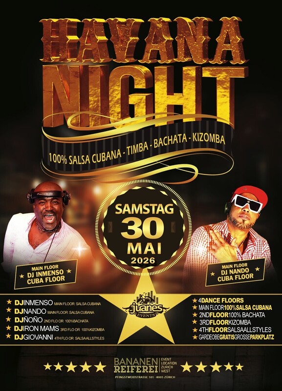 ★ HAVANA NIGHT ★ DJS Inmenso DJ Nando & Animation Bananenreiferei by Juanes SAMSTAG 30. MAI 2026 ●●●● ★ 4 Dance Floors ★ AB 22 JAHREN ★ DOORS: 21:30 – 04:00 UHR ★ EINTRITT CHF 20.- ★ GRATIS GARDEROBE ★ 400 AUTO PARKPLÄTZE ★ EINTRITT: BEZAHLUNG AN DER KASSE NUR BARGELD ★ GETRÄNKE-BAR: BARGELD & CREDITCARD ●●●● ★ MAIN FLOOR: * 100% CUBANO ★ DJ INMENSO ★ DJ NANDO 100% Salsa Cubana, Timba – Rumba - Fiesta ●●● ★ 2ND FLOOR: BACHATA: ★ DJ ÑOÑO 100% Bachata Fusion, Moderna, Clasica, del Recuerdo ●●● ★ 3RD FLOOR: KIZOMBA: ★ DJ IRON MAMS Kizomba - Semba - Tarraxinha - Afrohouse - Urban Kiz ●●● ★ 4TH FLOOR: SALSA ALLSTYLES ★ DJ GIOVANNI Salsa Allstyles, Puertorriqueña, Clasica, Mambo. ●●● BANANENREIFEREI Pfingstweidstrasse 101 8005 Zürich ●●● Bienvenidos Juanes Events https://juanesevents.ch/2-0-Events.html